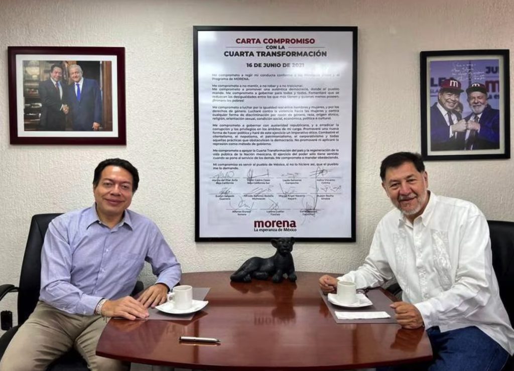 “Cafecito con el compañero @fernandeznorona para invitarlo a nuestro Consejo Nacional este domingo donde estableceremos la ruta para el 2024. Nuestro reconocimiento y cariño a Noroña por su contribución al movimiento″, dice el ‘tweet’ del dirigente morenista.