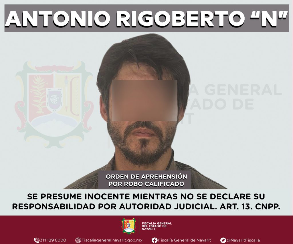 La Fiscalía General del Estado de Nayarit informa que a través de la Agencia de Investigación Criminal de Nayarit ejecutó una orden de aprehensión en el municipio de San Pedro Lagunillas contra Antonio Rigoberto “N”, por su presunta participación en hechos que la ley tipifica como delito de robo calificado, cometido contra una persona de sexo masculino de quien se reserva la identidad para salvaguardar su privacidad e integridad.