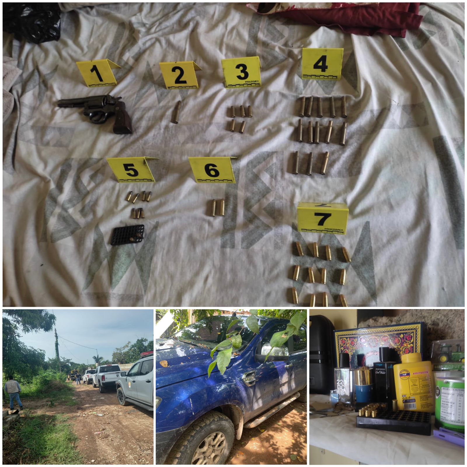 1.- Vehículo marca Ford, tipo Ranger, color azul, modelo 2017, con placas de circulación JV-64-002 del estado de Jalisco, el cual utilizó el autor del hecho para evadirse del lugar.\r 2.- Un revólver calibre .38 especial, marca Smith & Wesson.\r 3.- Un cartucho útil del calibre .30-30.\r 4.- 5 casquillos percutidos del calibre .38 especial.\r 5.- 13 casquillos percutidos del calibre .30-30.\r 6.- 9 cartuchos útiles del calibre .22.\r 7.- 2 cartuchos útiles del calibre .38 especial.\r 8.- 12 cartuchos útiles del calibre .9 mm.