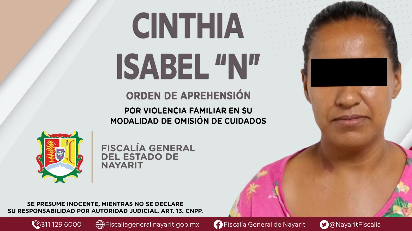 La Fiscalía General de Nayarit a través de la Agencia de Investigación Criminal, ejecutó una orden de aprehensión contra Cinthia Isabel\"N\", por su probable responsabilidad penal en hechos que para la ley constituyen el delito de violencia familiar en su modalidad de omisión de cuidados, cometido en agravio de tres niños de identidades reservadas.