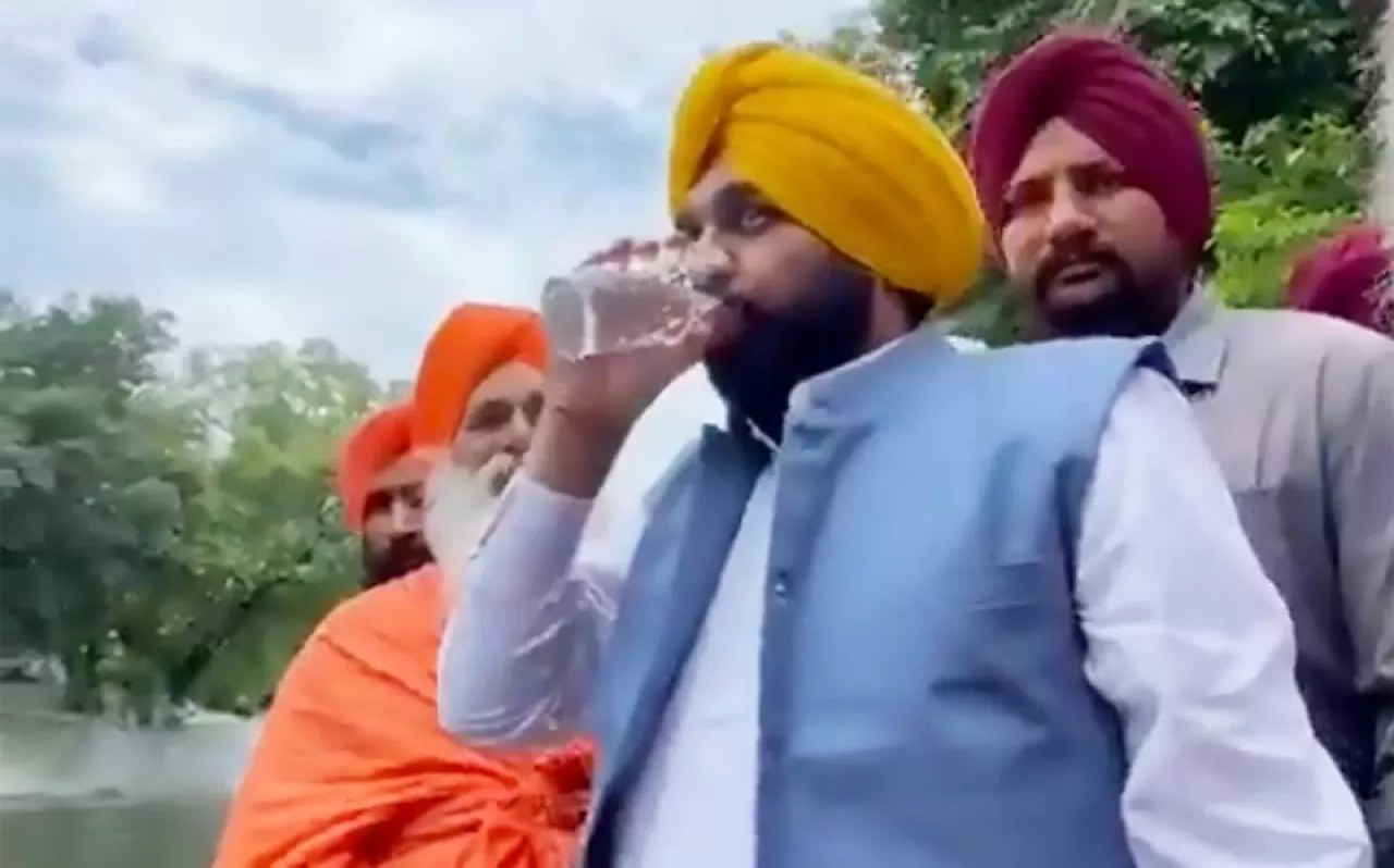 En el recorrido que realizó Bhagwant Mann, bebió del agua contaminada de un rio para demostrar que se encontraba limpia